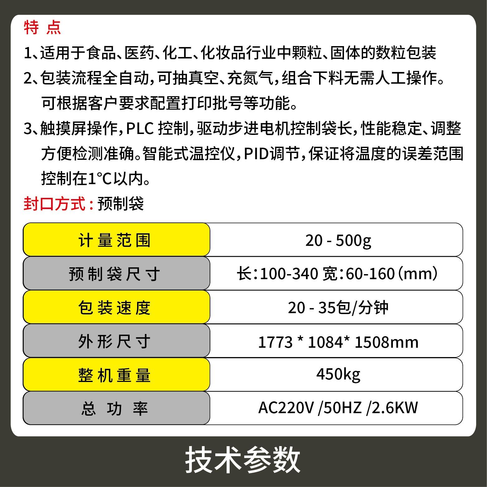 2、包裝流程全自動(dòng),無(wú)需人工操作,可抽真空、充氮?dú)?,組合下料。可根據(jù)充填物料的性質(zhì)選配不同的下料結(jié)構(gòu),且可根據(jù)客戶要求配置打印批號(hào)等功能。